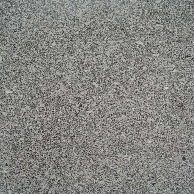 Granito de cor predominantemente cinza, com brancos e castanhos. Cores granuladas quando olhado de perto.