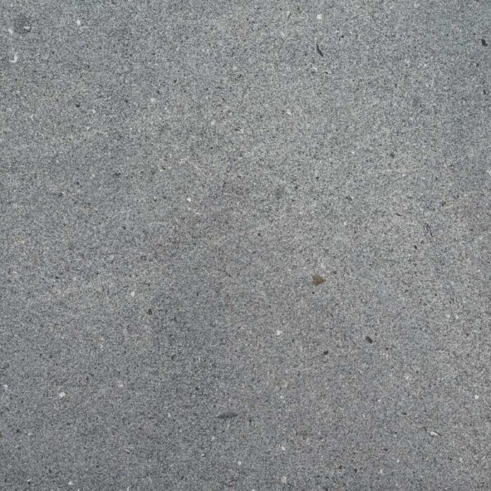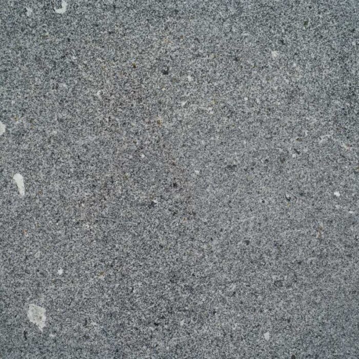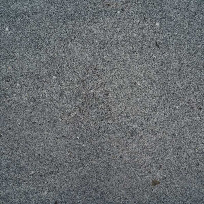 Granito de tons cinza escuro de textura granular homogénea e grão fino.